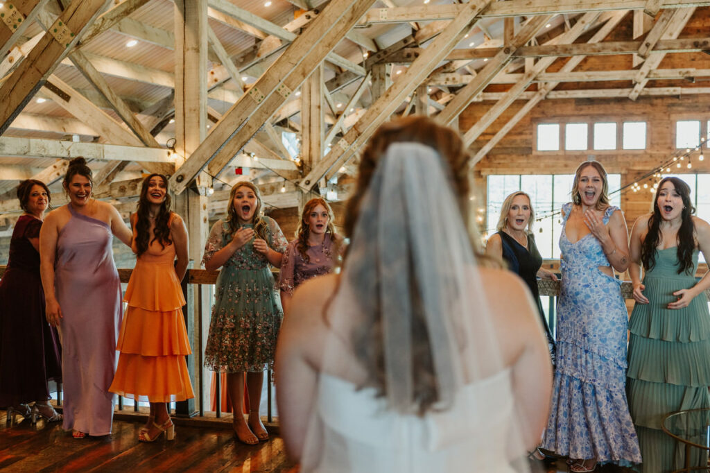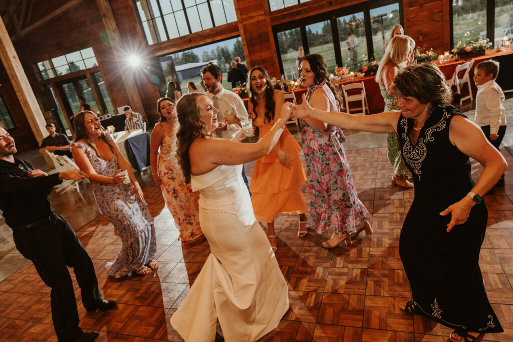 Leah and Ben’s orange wildflower wedding was at Snowline Acres, a historic venue in Kalispell with the perfect blend of rustic charm and natural beauty. Leah started the day with a series of first looks that helped get everyone in the wedding mood! She did a first look with her crew, her dad, and her grandpa, respectively. Each of these moments made everyone involved feel extra special, as they got to see Leah as a bride for the first time. Tears were definitely shed that morning!