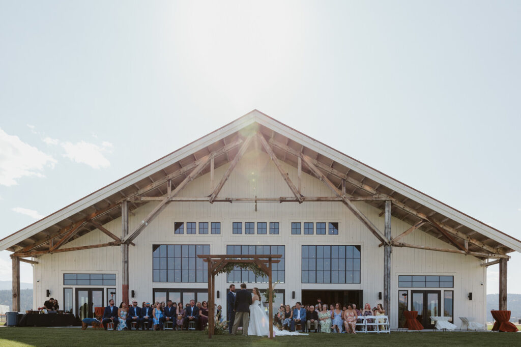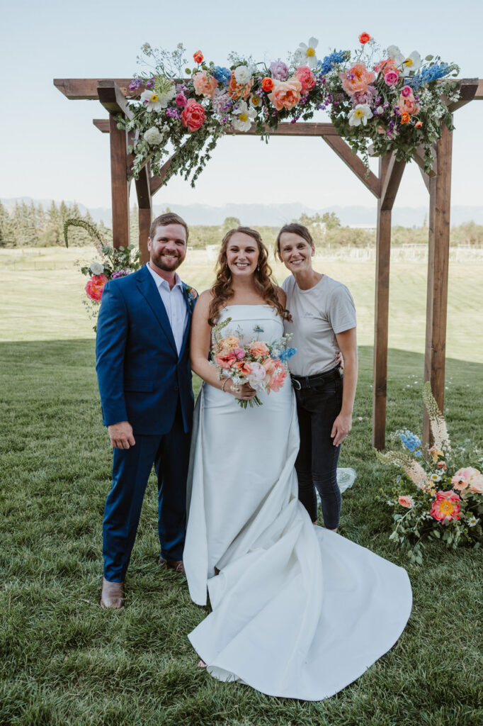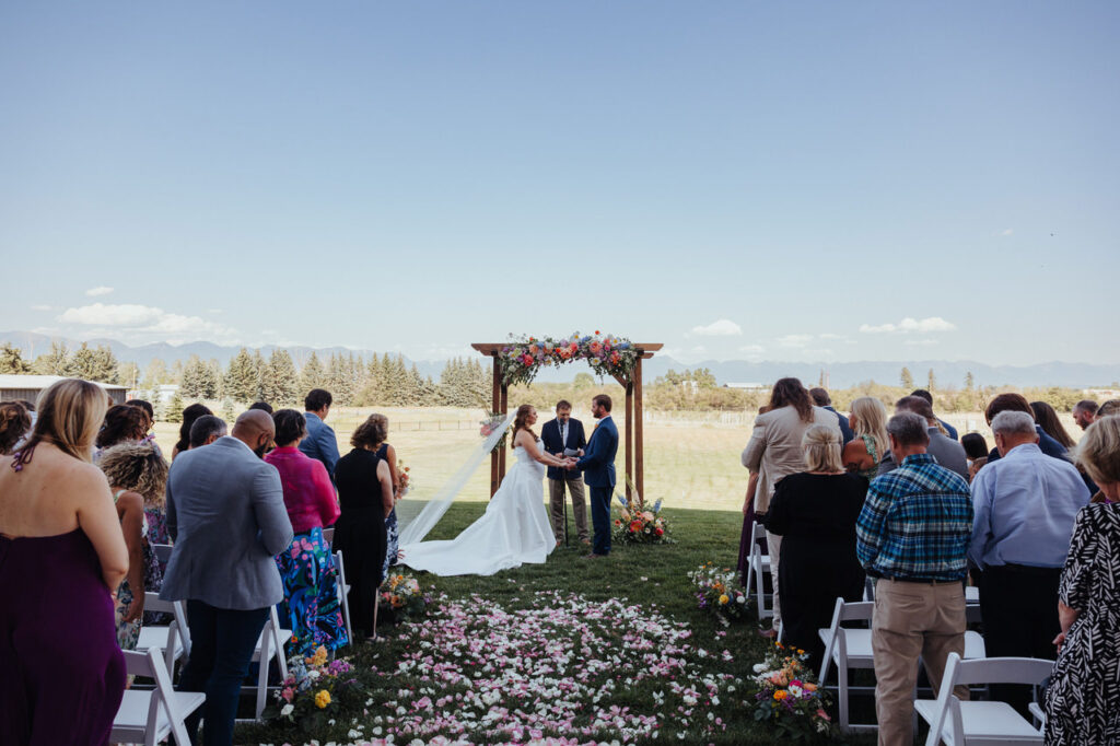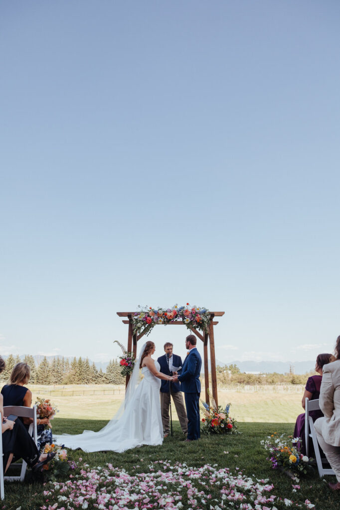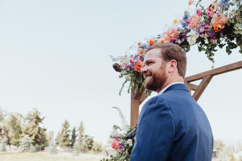 Meanwhile, our team prepared their outdoor wedding site for the ceremony. The vendor team installed a wooden archway that Leah and Ben would stand under and affixed lush floral sprays in shades of pink, blue, and purple to it. The arch was the perfect complement to the sweeping vista of the Flathead Valley and Swan Mountains.