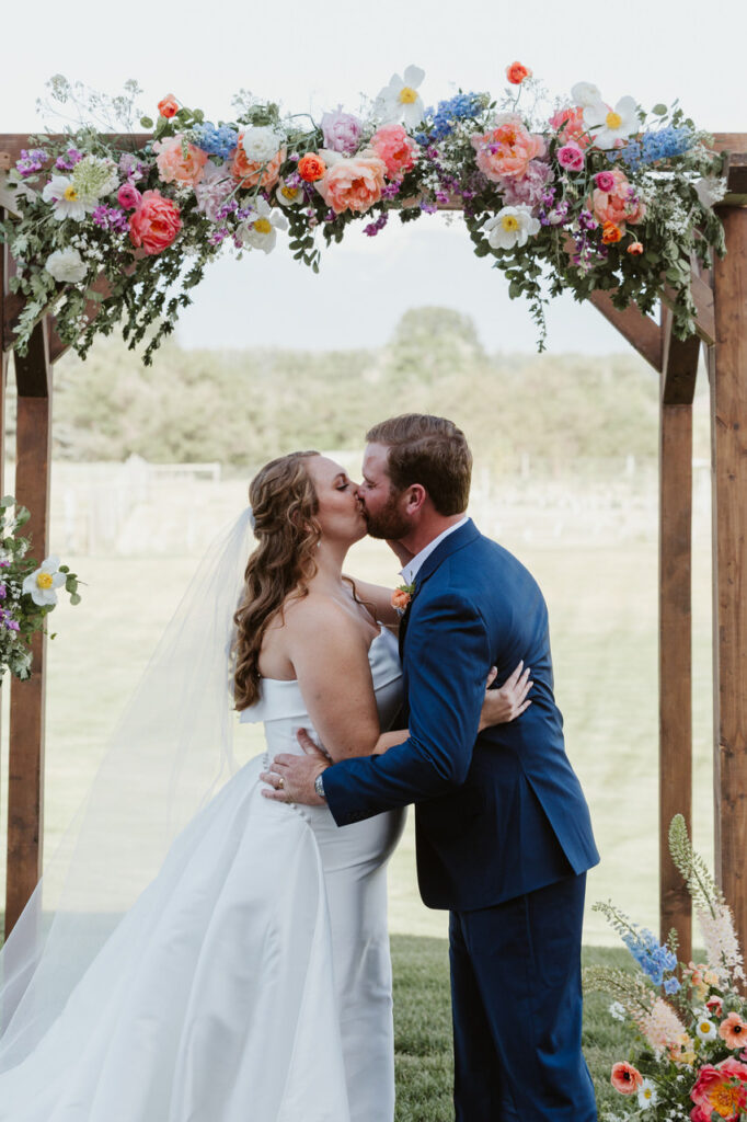 Leah and Ben’s wildflower wedding was a summer wedding dream! When you first walked in the space, you were struck by the cavernous ceiling, natural wooden beams dotted with twinkle lights, and the floor-to-ceiling windows that looked out over the mountains. Then, you were amazed by the vibrant color that we infused into each and every reception design element!