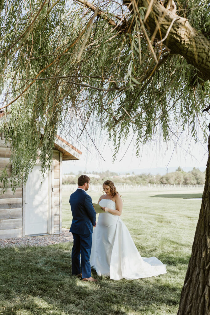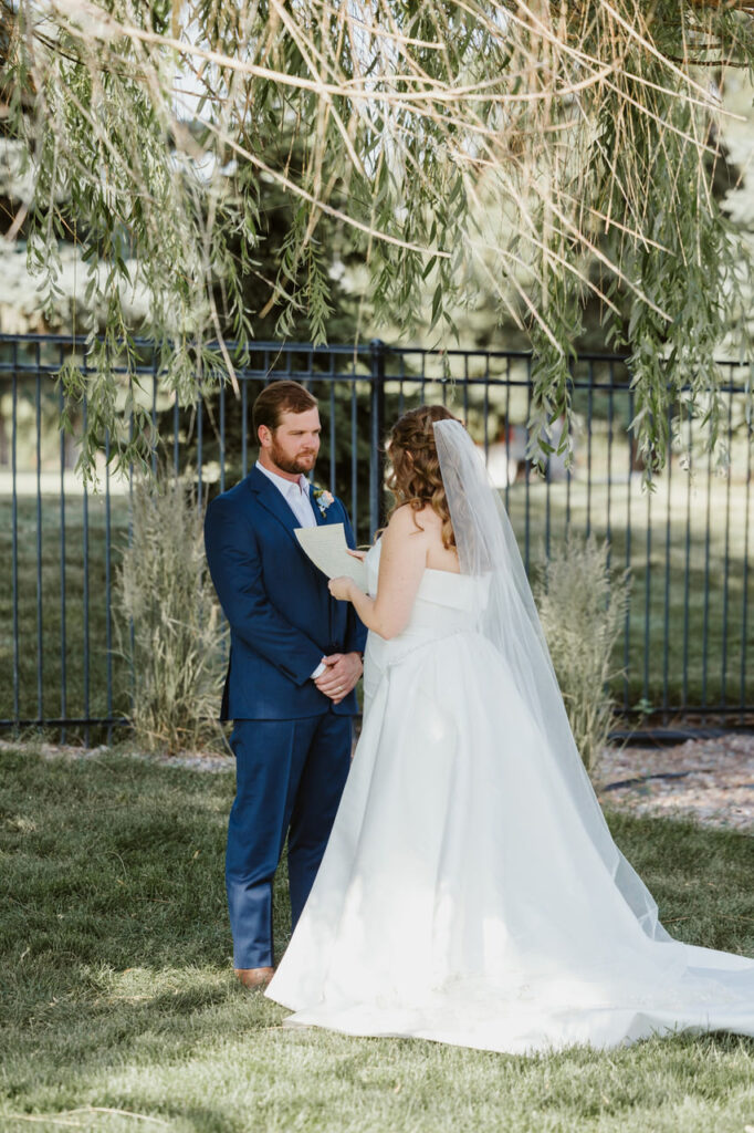 After signing their marriage license (they even had their dog, Tanner, autograph it with his paw print!), Leah and Ben found a quiet little spot under a willow tree for a private moment. This is when they exchanged private vows and had time together to soak everything in. Many times, couples will opt for a first look paired with a private vow exchange before the ceremony, but we love that Leah and Ben stayed true to themselves and did this after the nuptials on their own terms.