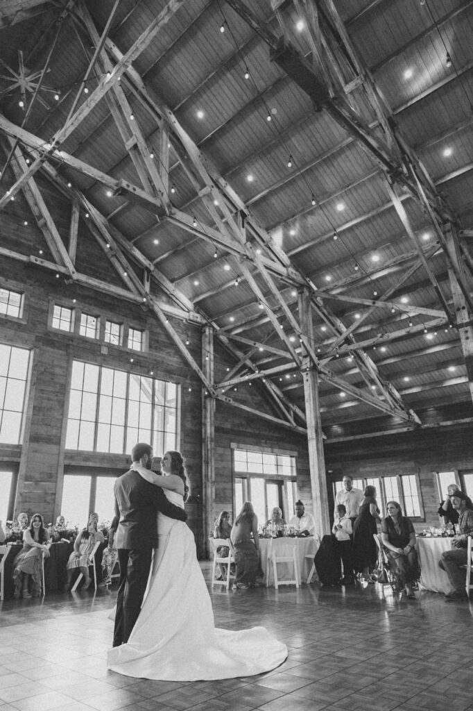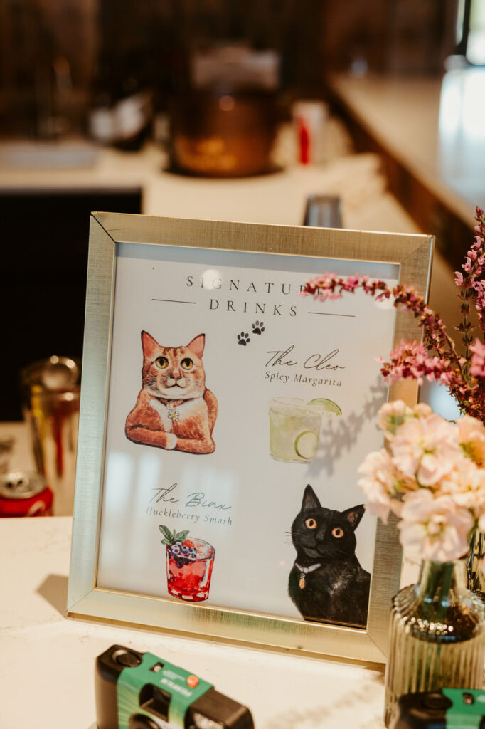 Back at the venue, the newlyweds’ loved ones were enjoying cocktail hour, complete with bacon-wrapped chicken skewers, elk short loin, and roasted garlic and burrata crostini appetizers. During cocktail hour, our team has the important job of ensuring the reception space is fully ready and picture-perfect for you and your guests. Sometimes, this involves repurposing items from the ceremony in the reception area.