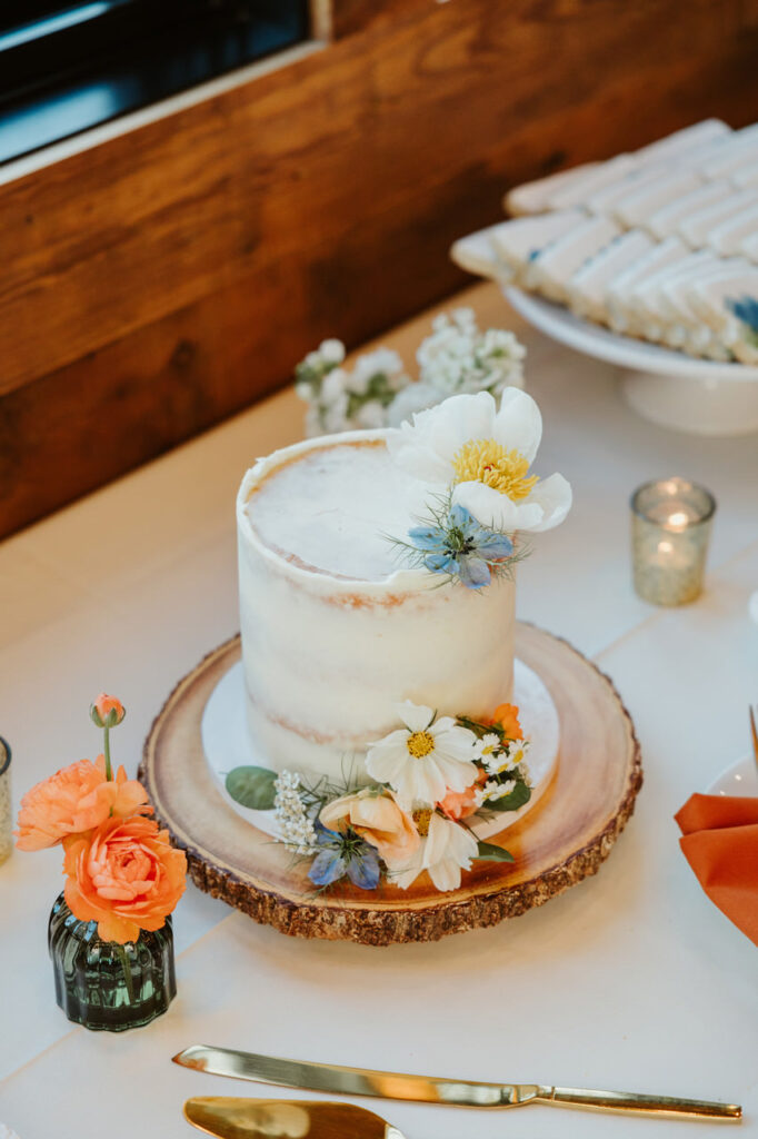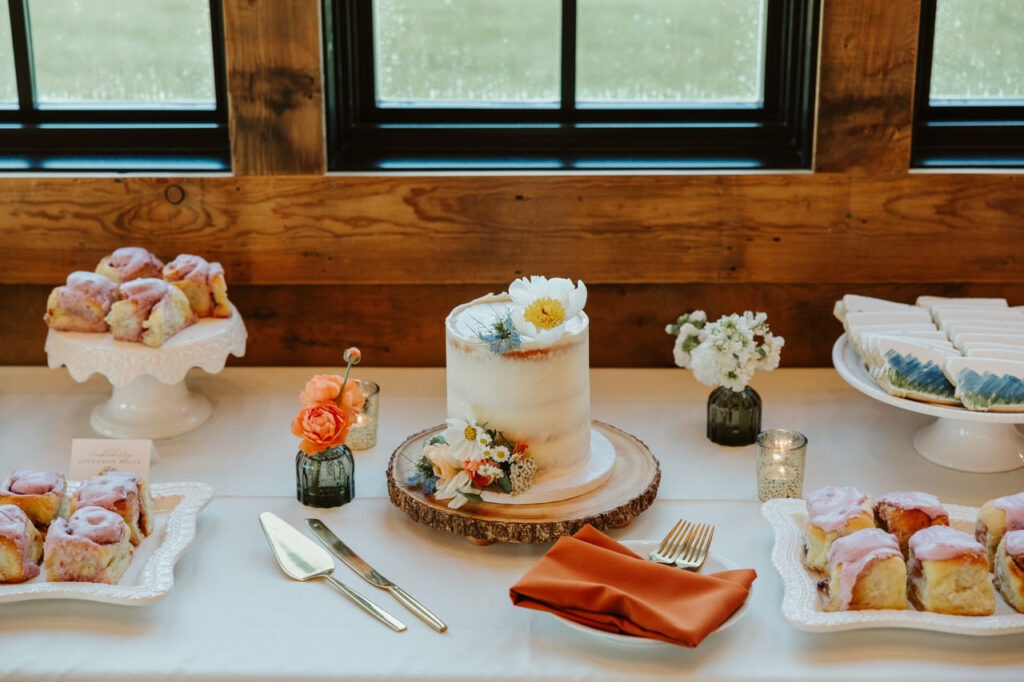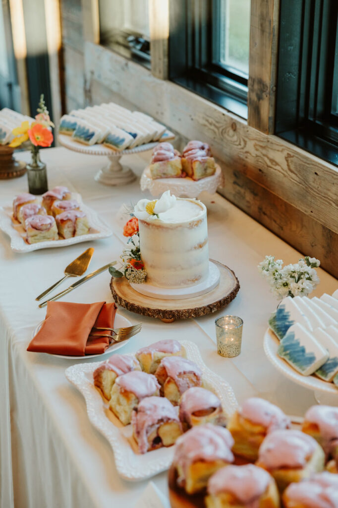 There were the orange linens accented by wooden chargers and rust velvet napkins. The textured amber glassware, smoky green bud vases, and huckleberry jam favors popped on the tables. Plus, there was the cutie one-tier naked glass embellished with fresh flowers. This was accompanied by huckleberry-topped cinnamon rolls and Montana-themed custom cookies for dessert.